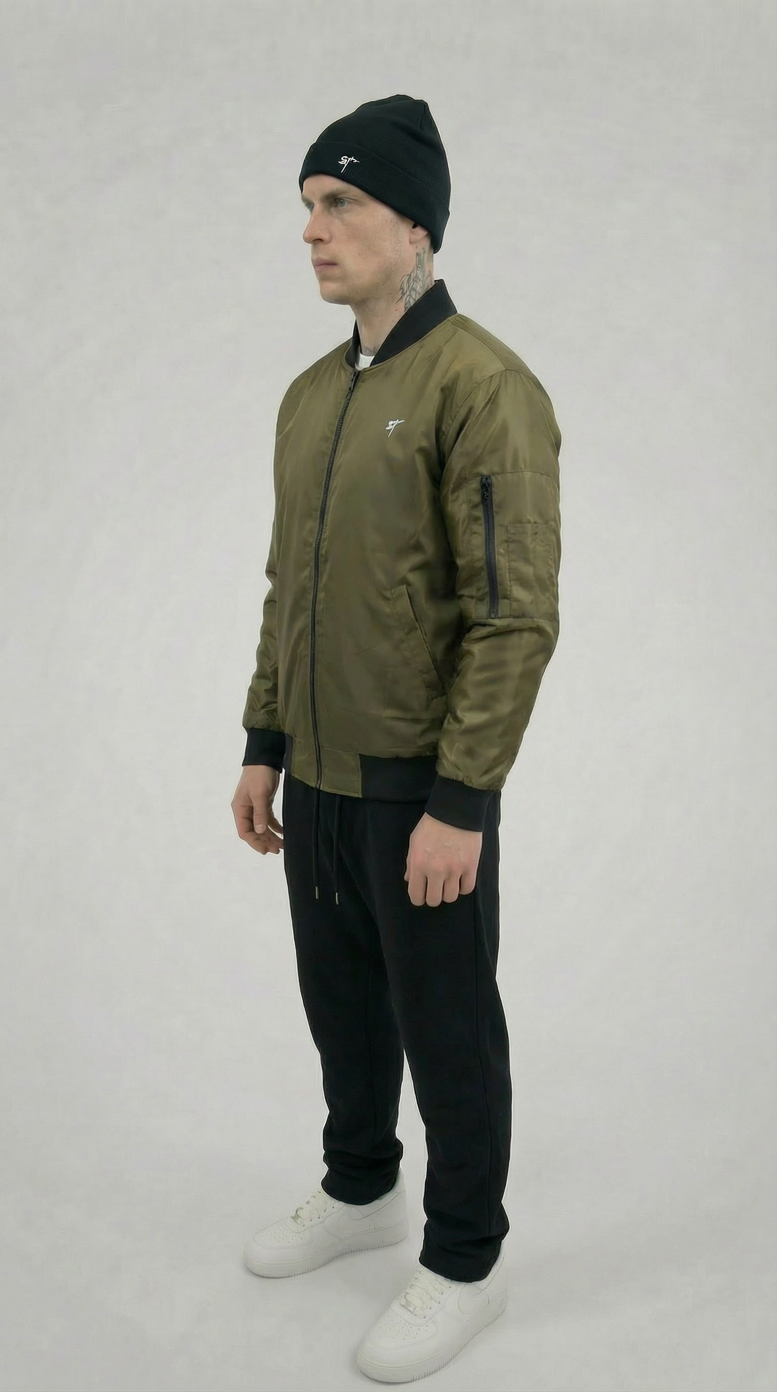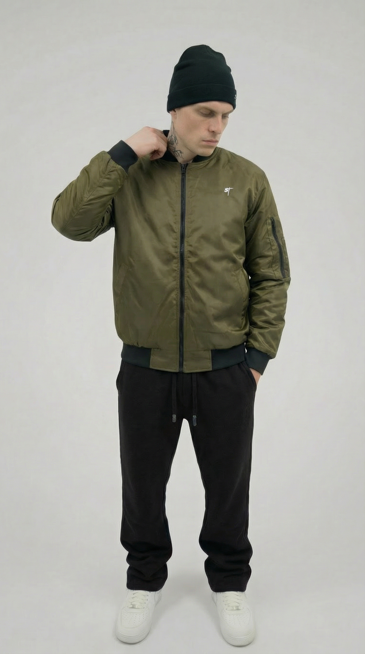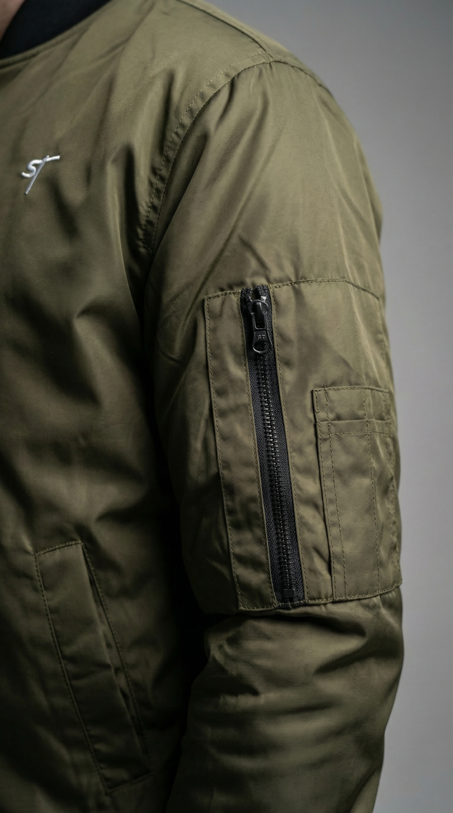 Klassische Bomberjacke in sattem Olive mit schwarzem Kragen und Bündchen. Dezentes ST-Logo auf der Brust für den Signature-Look.