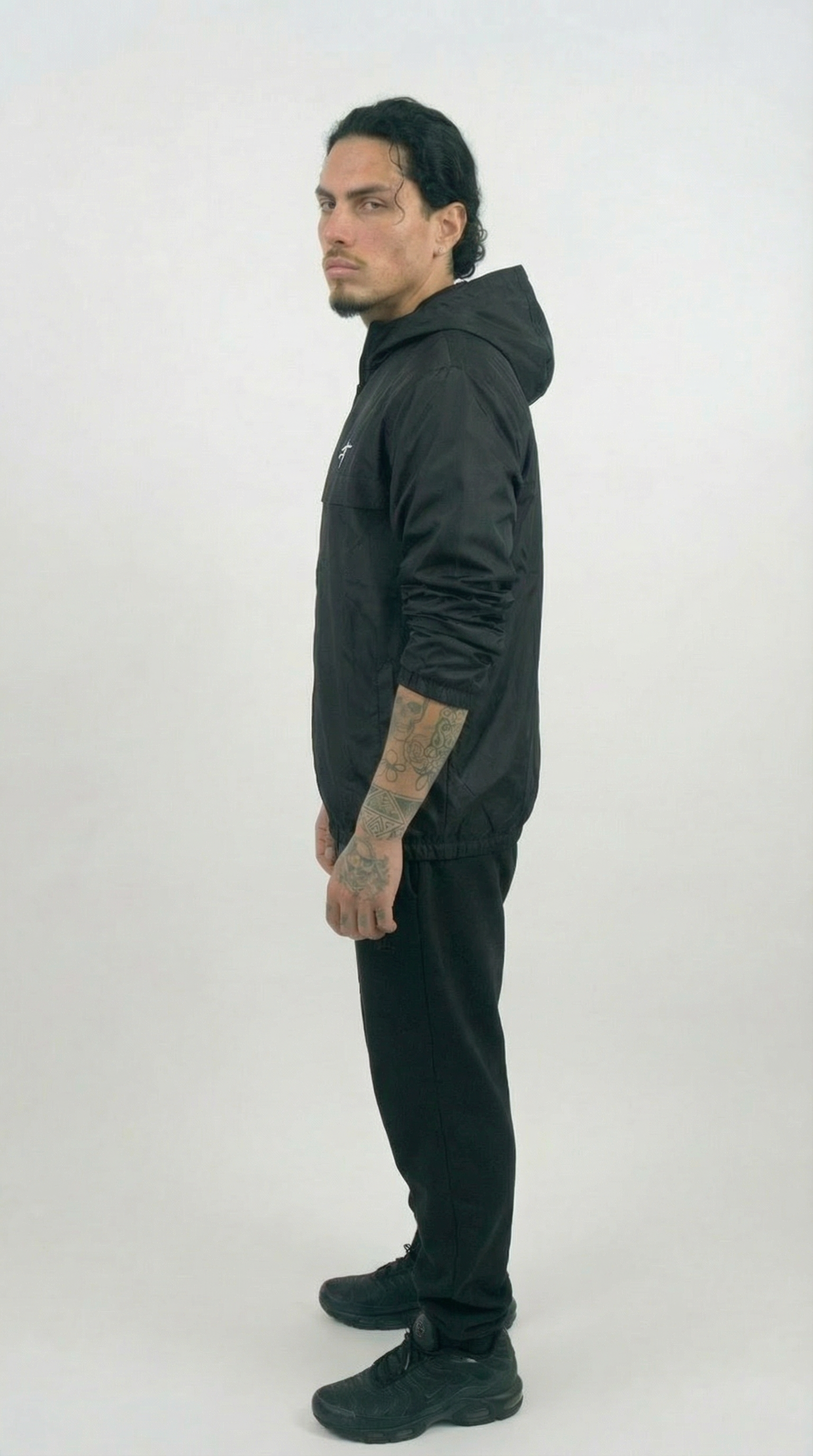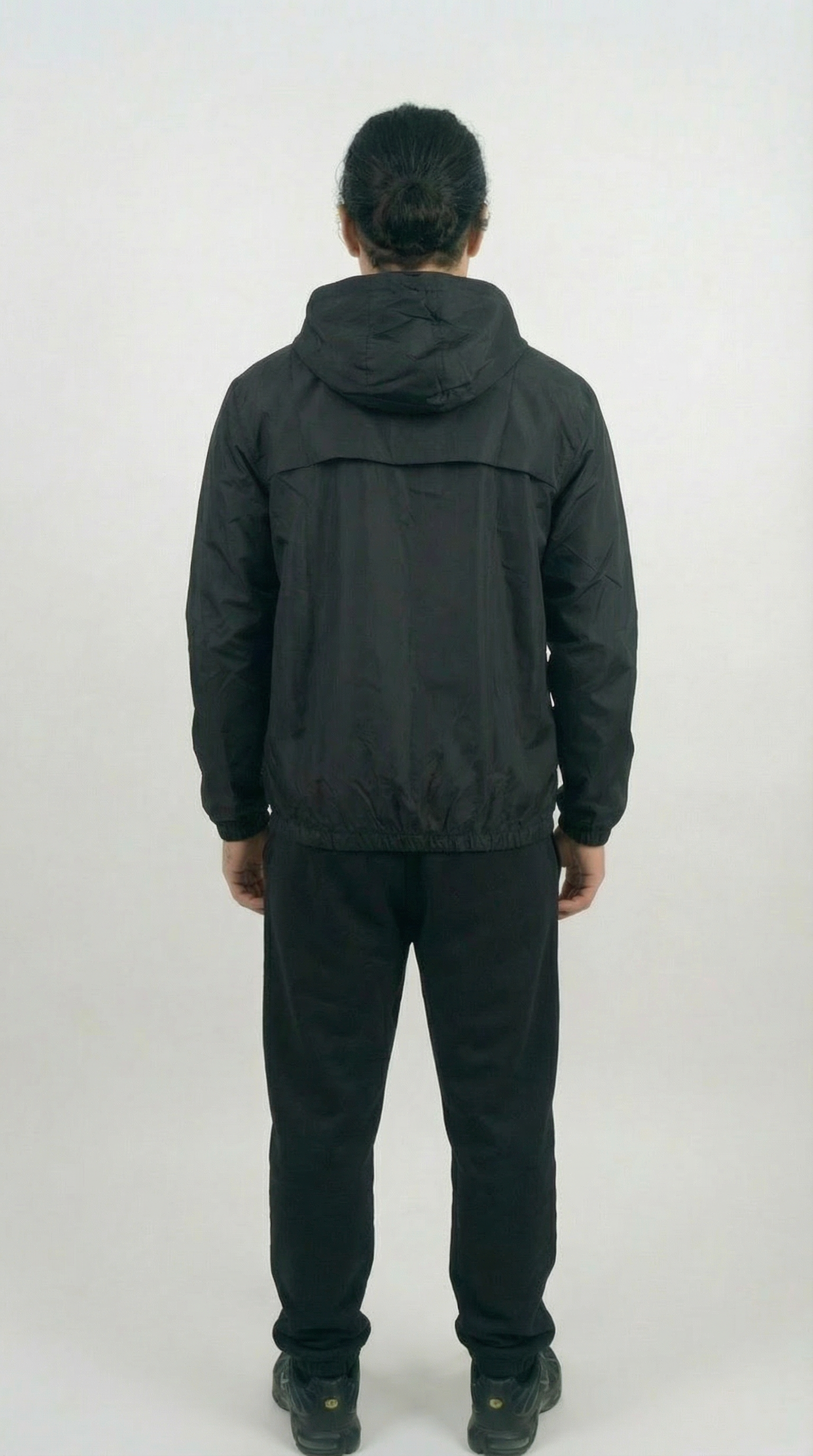 – Schwarzer Windbreaker mit Kapuze